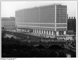 Version vom 3. Juni 2016, 21:07 Uhr von Admin (Diskussion | Beiträge) ({{Information |Beschreibung = Ministerium für Auswärtige Angelegenheiten der DDR |Quelle = https://commons.wikimedia.org/wiki/File:Bundesarchiv_Bild_183-F0915-0213-001,_Berlin,_Aussenministerium,_Br%C3%BCcke,_Spree.jpg |Urheber = Studré |Datum =…)